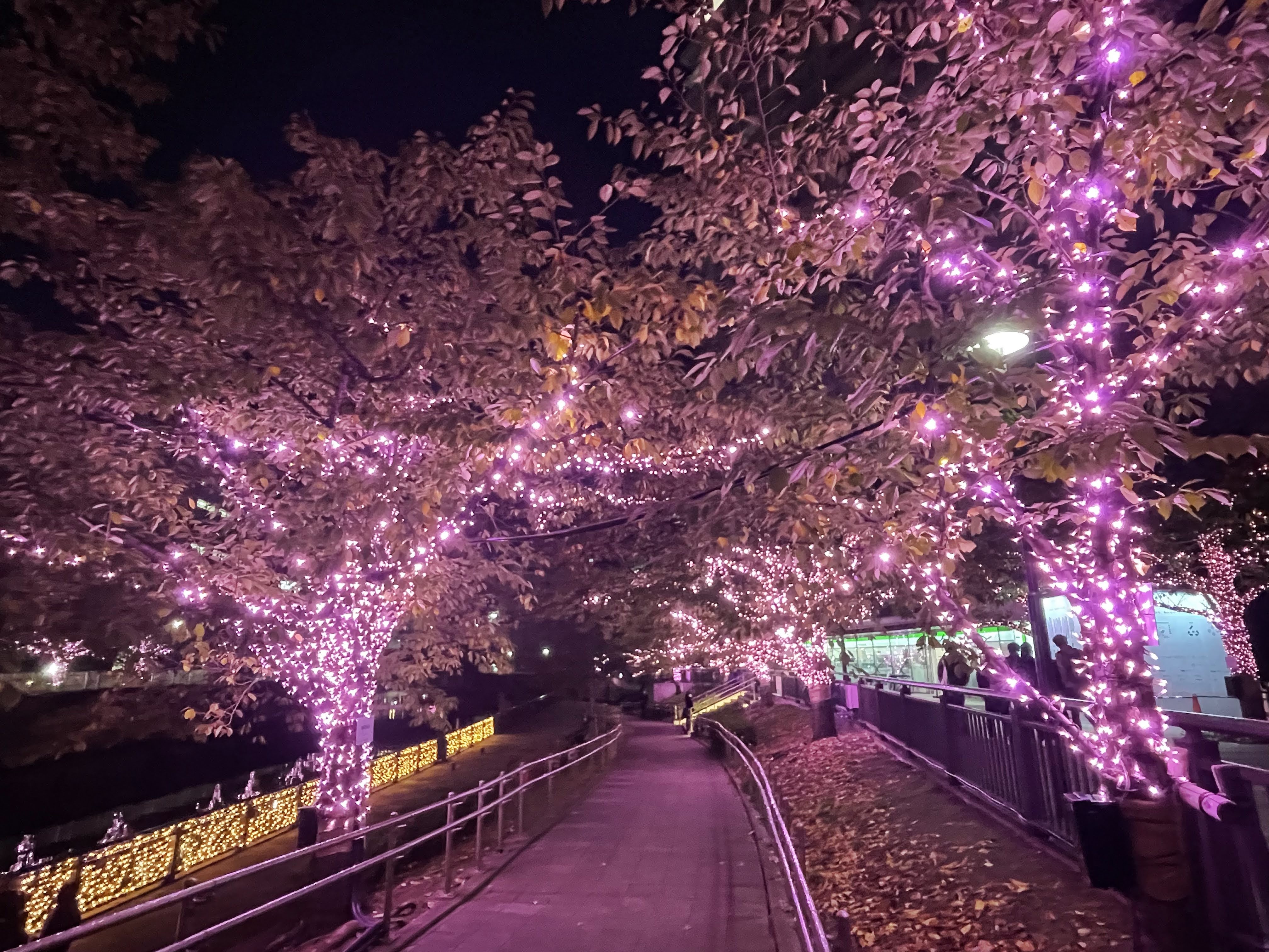 A Gotanda, lungo il fiume Meguro, quelli che in primavera sono dei bellissimi Sakura fioriti, in inverno diventano dei Sakura illuminati. Gli alberi vengono infatti riempiti di luci di colore rosa e rappresentano simbolicamente la fioritura dei ciliegi durante le feste. Le luci si riflettono tutte sul fiume Meguro creando un’atmosfera suggestiva.