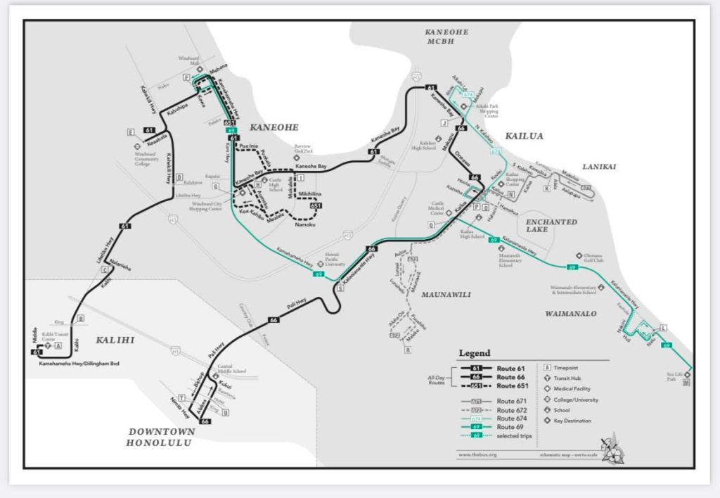 Bus 66 fino a Kailua (vicino allo shopping center) e poi autobus 671 per Lanikai. Qui sotto una mappa illustrativa che puoi aiutarvi a capire il percorso delle varie linee che raggiungono l’area di Kailua e Lanikai.